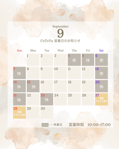 「コトを想像し、コトを創り上げていく」「colorが創る世界・暮らしを楽しんでほしい」「あなただけの『いろどり』を見つけてください」「想像を超えた創造を提供します」イベント企画・制作セミオーダー帆布バッグNEW 2025年8月7日 お知らせ 【イベント出店】2025年8月9日びんずる市に出店します 2025年6月18日 CoToYa 【プレスリリース】BEAMS JAPAN × CoToYa|伊那紬と帆布が織りなす、新しい“日常”。 2025年6月11日 お知らせ 【イベント出店】2025年6月14日びんずる市に出店します 営業日 2025年10月1日 営業カレンダー 10月営業日のお知らせ 2025年9月1日 営業カレンダー 9月営業日のお知らせ 2025年8月1日 営業カレンダー 8月営業日のお知らせ