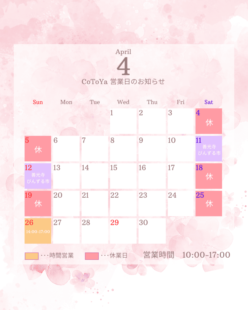 2026年4月営業日のお知らせ 2026年3月31日 営業カレンダー2026年4月の営業カレンダーです。店舗においでの際の目安にしてください。ご来店を心よりお待ちしております。 CoToYaのセミオーダーについてお気軽にお問い合わせください。TEL: 026-217-1718お問合せはこちら